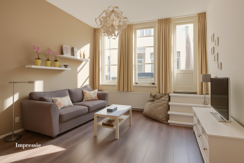 1e verdieping: privé-entree, hal, lichte woonkamer van maar liefst 6.10 breed (!) met grote ramen en openslaande deur met Frans balkon. Luxe open keuken (wit en "gerookt eiken" kasten) met kunststof aanrechtblad met rvs spoelbak, circulatiekap, gaskookplaat, combi-magnetron, koelkast, vaatwasser en veel kastruimte. Grote slaapkamer aan de achterzijde. Inpandige badkamer met witte wandtegels en antraciet vloertegels, mooie douchecabine, wastafel met meubel, toilet. Aparte berg-/cv-/wasruimte.